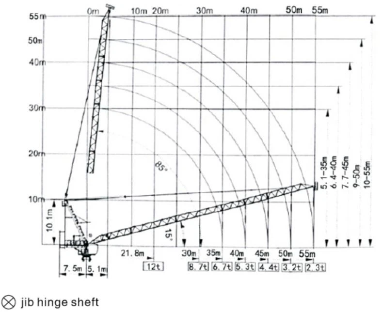 Luffing Tower Crane QTD 5523 with max load of 10tons or 12tons, Boom length of 55m and tip load 2.3t. Mast: 2*2*3m.